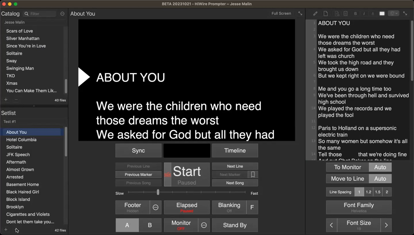 Focus Arrow - Hold cursor on the arrow to slide up and down the left edge of the prompter screen. Drop-Down HiWire Prompter> Settings To customize size, color, or option not to use the arrow. Also in settings is the option to have an alternate color to toggle between if the operator needs to signal the speaker without audio cues. This is the starting point- Click next to the Artist field. Enter Catalog Title - Artist/Cover Songs/Speeches/ Medlye's/etc Drag and drop TXT,RTF,DOC, DOCX files into the Catalog field. To Delete Files - Click on file to highlight then click the "-" button at the lower left of that field. Search Filter - Option to search by title or by included text (if you don't have the title) If the singer starts a song you can search by text and this field willl display all files that include the words entered. BUILDING SETLISTS Click under setlist field to create a name. Either drag and drop files from the Catalog field into the Setlist field. Or Highlight the desired file and enter CMD+D. To Delete Files - Click on file to highlight then click the "-" button at the lower left of that field. Use "+" to add files to the SETLIST "-" to delete highlighted files EDITING WORK AREA SMPTE OPERATION Once an audio interface is connected to the computer and signal is being sent click on SYNC to bring up the Timecode display on the panel next to this button. After SYNC is activated and signal is confirmed in the center panel click on TIMELINE to bring up lyrics and timecode values to begin programming. Refer to https://www.hiwireprompter.com/smpte-guide For setup instructions. To START SCROLLING- If the keyboard symbol next to the START button is RED then click on the symbol to activate (Will turn GREEN). Click START to begin scrolling. Speed 1-9 1 - Slowest 9 - Fastest 0 - STOP SPACEBAR- START/STOP Can program these values into peripherals. Contour Shuttles, Numeric Keypads, etc SPEED CONTROL SLIDER- Shows the current scrolling speed. Useful if you used a high speed at the end of a song and left the speed at 8-9 at the beginning of the next song. So you don't jump past lyrics by accident at the top of a song. These button are fairly self explanatory. SETTING MARKERS- in the Edit window (right panel) click on the line number corresponding to the line you wish to place a marker. To Remove marker - click on the existing marker. Add a Footer column across the bottom to display information without blocking the exiting scrolling text. Options include: Elapsed time Countdown time BPM light City/Venue Information A discreet way to relay information to the artist during the performance. A/B SWITCHING - Created for a specific situation. If the artist unexpectedly transitions from the current song into a different file. You can hit B and find the song they now playing. When the artists transitions back you click A and they return to the exact spot that they were at before the transition. STANDBY- Activate if you need to work on the computer and don't want the images displayed on the external screen BUT you want to see the Focus Arrow. TO MONITOR- When "Auto" is highlighted everything in the center screen is displayed on the external monitor. Turn off to make an edit in the current file without the image change on the external display. Then reactivate the To Monitor when the edit is completed. MOVE TO LINE- When activated the center panel will track to the corresponding line the cursor is located on the EDIT PANEL. LINE SPACING- Changes line spacing for the entire file. If you want to scroll line by line. To see all markers set on the current file. This is helpful if a speaker has a longer script and you need to navigate to a corresponding section instantly. NEW FILE For pasting sections that may be needed but don't need in the current script. Saves with the clipboard. highlight section and hit this button and it will be saved to clipboard. Clipboard to see all the saved "snippets". EXPAND EDIT WINDOW- Activate to display the EDIT window as Full Screen. BLANKING - When you need to make edits or work on the computer and don't want to images to be displayed on the external monitor(s). External displays may go to sleep , or shut off, if a signal is not detected after a set amount of time, so BLANKING will send signal , but not image. F button- If you want to blank the external monitors but display the Footer (City name, etc.). MONITOR- If OFF then the computer is either disconnected from an external display or there is signal loss. The Setting button will show which display the computer/HWP detects. HWP saves the last resolution used when plugged in and HWP was used. This is helpful if you need to create/edit files while disconnected and need to keep file alignment. i.e. Files with chords and lyrics. PRIOR TO HWP I've suffered the pain of spending hours lining up chords above the corresponding lyrics and then once I plugged the computer into the display on site everything became scrambled. EDIT BUTTON- Activate to make edits in the file currently in the edit panel. Click again to deactivate EDIT mode. FULL SCREEN- Expands the center prompting display to FULL SCREEN. Focus Arrow - Hold cursor on the arrow to slide up and down the left edge of the prompter screen. Drop-Down HiWire Prompter> Settings To customize size, color, or option not to use the arrow. Also in settings is the option to have an alternate color to toggle between if the operator needs to signal the speaker without audio cues.